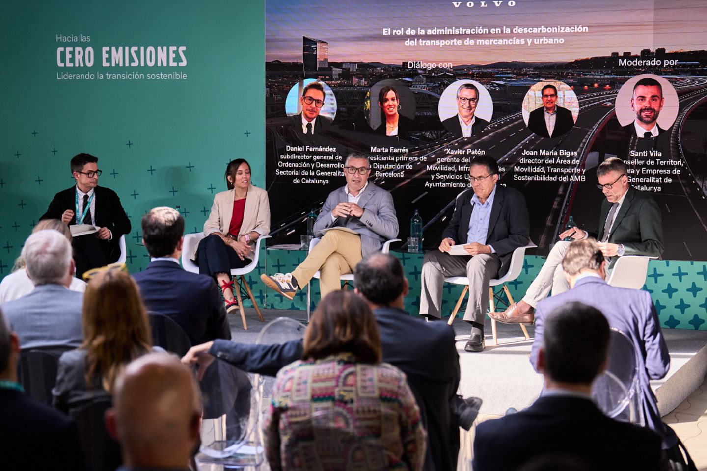 El acto organizado por Volvo contó con destacadas personalidades de los sectores público y privado. Tras la bienvenida y los discursos institucionales de Bruno y Obrer, la primera mesa redonda abordó el papel de la administración en la descarbonización del transporte de mercancías. Contó con la participación de: Daniel Fernández, subdirector general de Ordenación y Desarrollo Sectorial de la Dirección General de Transportes y Movilidad de la Generalitat de Catalunya; Xavier Patón, gerente de Movilidad, Infraestructuras y Servicios Urbanos del Ayuntamiento de Barcelona; Joan Maria Bigas, director de Movilidad, Transporte y Sostenibilidad del Área Metropolitana de Barcelona (AMB); y Marta Farrés, vicepresidenta primera de la Diputación de Barcelona, con la moderación de Santi Vila, exconseller de Territorio, Cultura y Empresa de la Generalitat de Catalunya.
